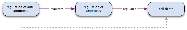 For example, regulation of anti-apoptosis regulates regulation of apoptosis, which, in turn, regulates cell death, but we cannot draw any conclusions from these statements about the relationship between regulation of anti-apoptosis and cell death.